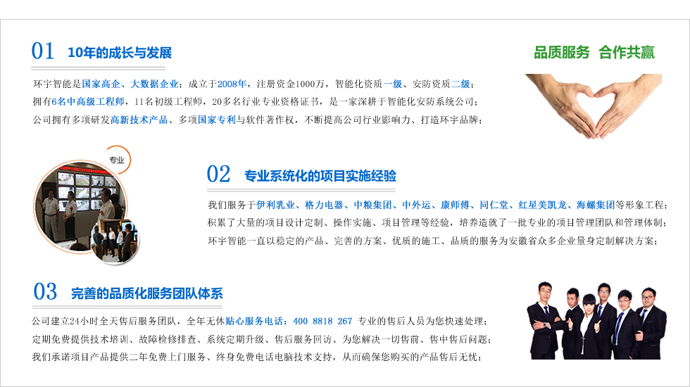 合肥市環宇智能工程有限公司成立于2008年,科創版上市企業,現注冊資金1000整,電子與智能化系統集成資質壹級,安防資質,是“國家高新技術企業”、“合肥市高新技術產品認定企業”、“安徽省安防協會會員單位”、“AAA級信用等級認證企業”、“AAA級重合同守信用企業”、“合肥市創新型企業”、是行業領先的智能化整體解決方案的集成商